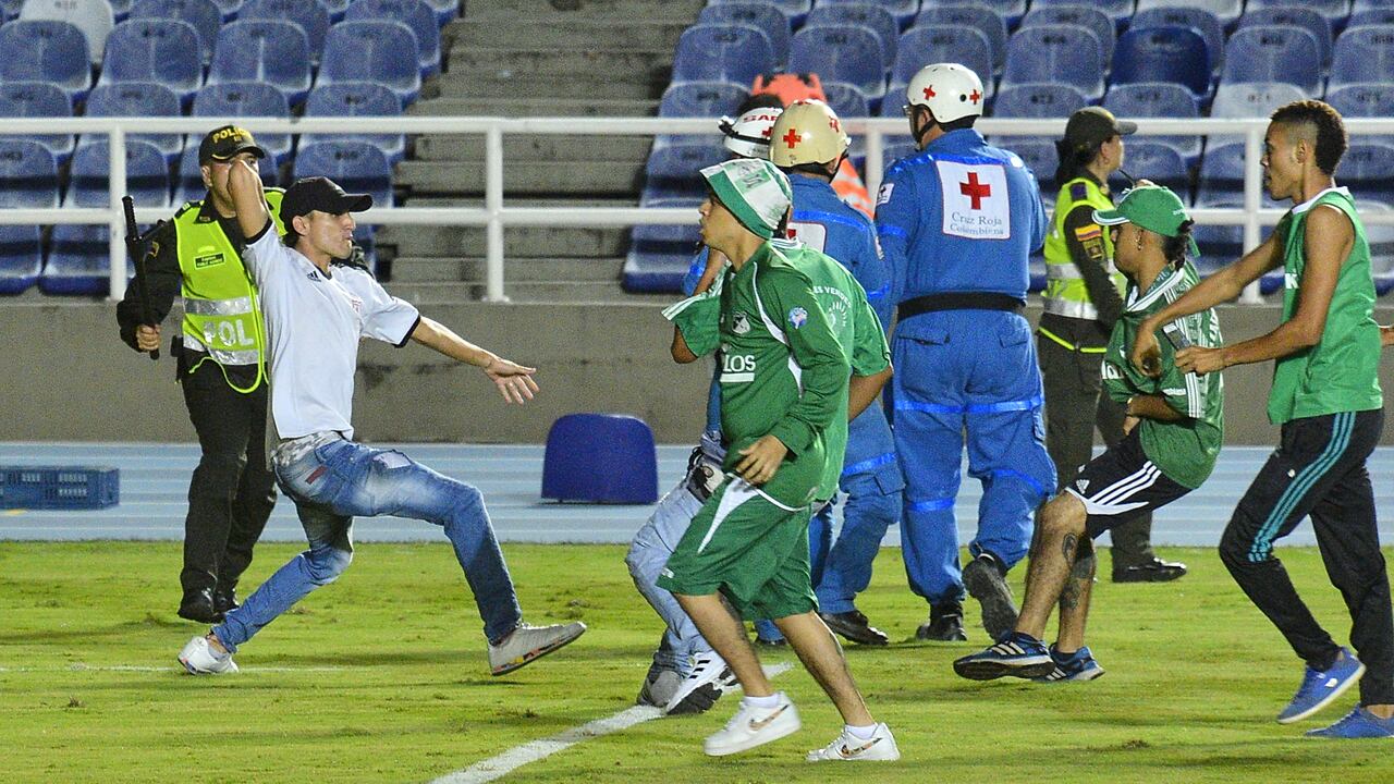Dos heridos, uno de ellos por arma de fuego, y una batalla campal con cuchillos en la grama del Pascual Guerrero fueron la nota predominante en una noche en la que la violencia opacó al fútbol.