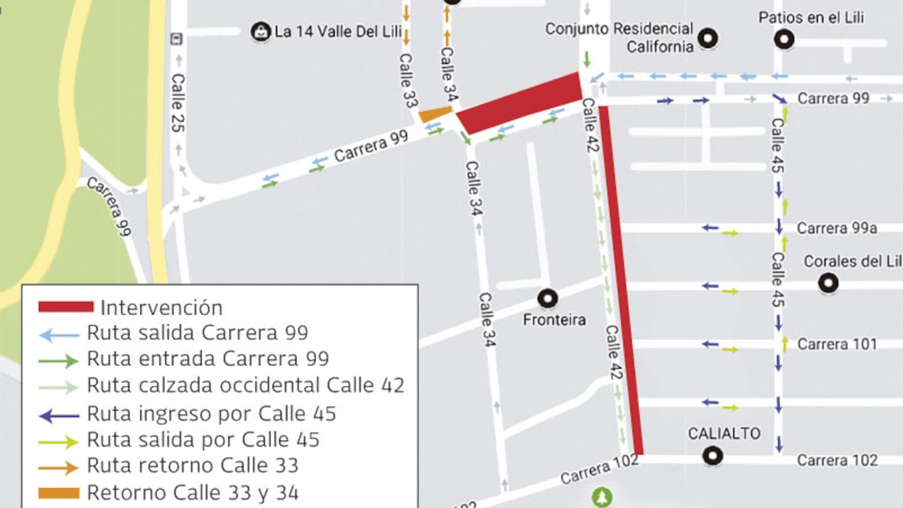 De acuerdo con el plan de manejo de tráfico se realizará total del costado oriental de la Calle 42 entre las carreras 99 (Edificio Palmanova) y 102 (sector de la Unidad Residencial CaliAlto). Esto indica que la calzada occidental de la Calle 42 conservará su sentido actual y que el ingreso y salida de los habitantes de las unidades residenciales del sector se realizará por la Calle 45 para después tomar la Carrera 99. (Ver gráfico).