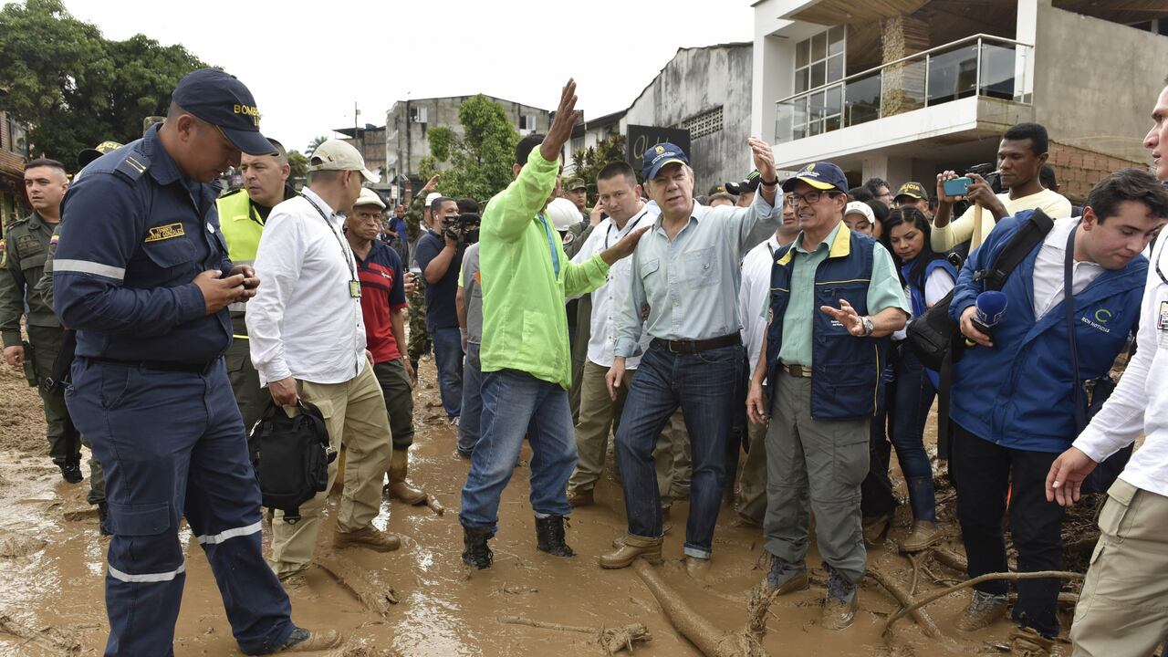 Santos llegó acompañado de los ministros de Minas y Energía, Germán Arce; de Transporte, Jorge Eduardo Rojas; del Interior, Juan Fernando Cristo; y de Vivienda, Elsa Noguera, para agilizar el restablecimientos del os servicios básicos fundamentales para Mocoa.