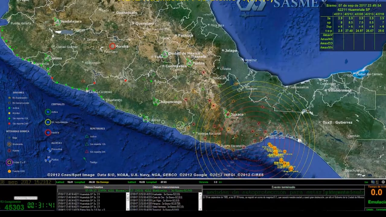 Sasmex tiene instalados 97 sensores sísmicos que cubren la Costa del Pacífico desde Puerto Vallarta (Jalisco) hasta Puebla. Hoy en día los avisos de alerta a la población abarca a Acapulco, Chilpancingo, Morelia, Oaxaca, Puebla, Toluca y Ciudad de México. El origen del terremoto se debió al contacto entre dos placas tectónicas: la de Cocos y la del Caribe. La interacción entre estas dos estructuras tuvo lugar en la costa del Pacífico, frente a Chiapas. Pero, ¿cómo operó el sistema nacional de alertas durante los 120 segundos que duró el sismo? Este viernes el Sasmex divulgó un video en redes sociales donde se observa la grabación de todo el proceso que tuvo dos fases: la detección del epicentro del sismo y la activación de las sirenas para que las personas evacuaran hacia sitios seguros.