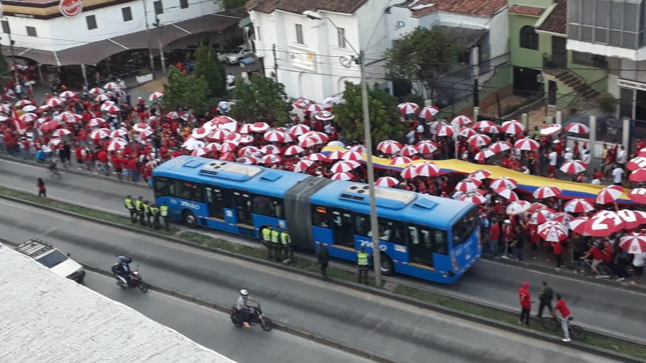 El recorrido, que finalizó en el Parque de las Banderas, en las inmediaciones del Estadio Pascual Guerrero, con un banderazo, fue realizado por una multitud de hinchas escarlatas, que usaban prendas alusivas al equipo rojo y entonaban cánticos característicos del 'Diablo'.
