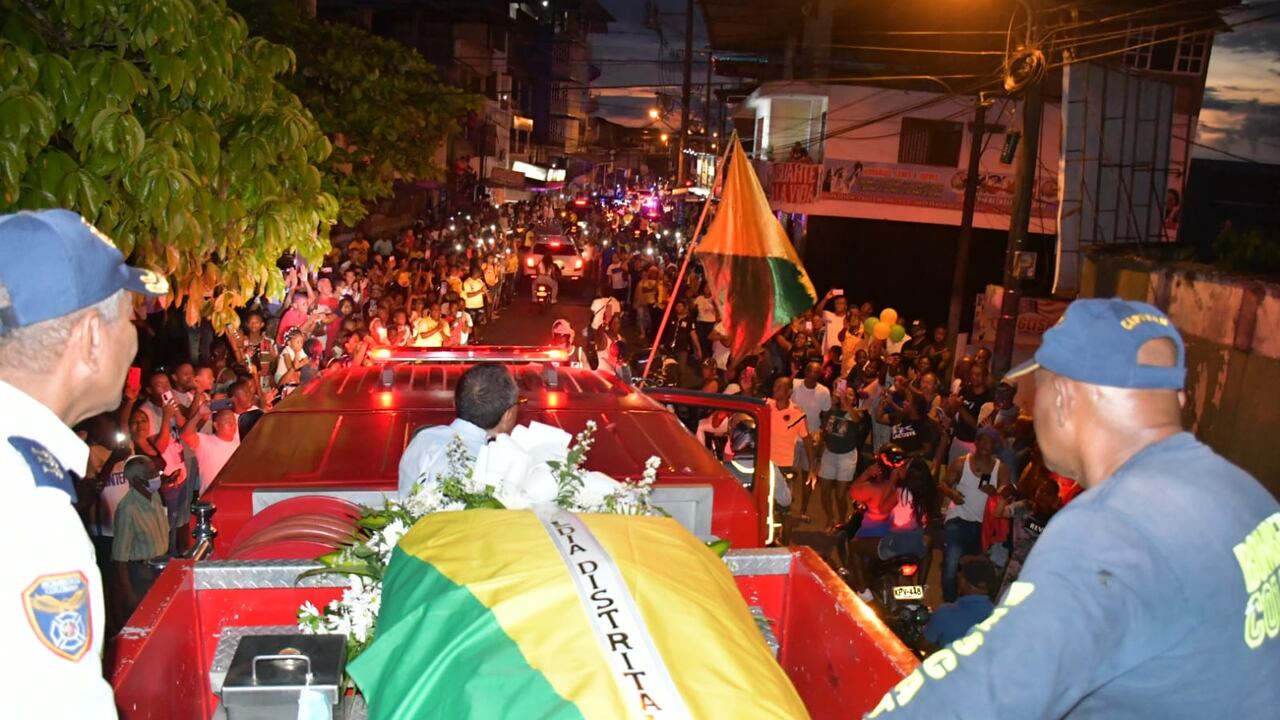 El féretro con el cuerpo de Freddy Rincón llegó hacia las 5:40 p.m. de este jueves a Buenaventura para empezar el recorrido por la tierra natal del exfutbolista, y donde se realizarán sus honras fúnebres en una cámara ardiente en el Coliseo Roberto Lozano Batalla. El féretro con el cuerpo del exjugador llegó en un vuelo chárter desde el Aeropuerto Alfonso Bonilla Aragón y fue recibido por una caravana liderada por un carro del Cuerpo de Bomberos de Buenaventura en el que el ataúd fue decorado con flores. Lea aquí: Freddy Rincón: la historia de un atleta puro