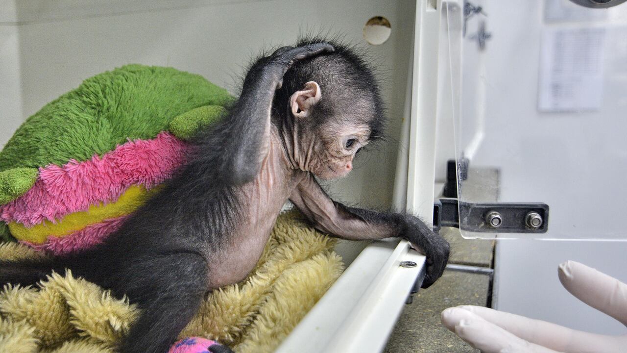 Olivia, una cría de mono araña y que al parecer cayó de los brazos de su madre quedando es un estado delicado de salud fue intervenida por un grupo de veterinarios del Zoológico de Cali que lograron salvarle la vida.