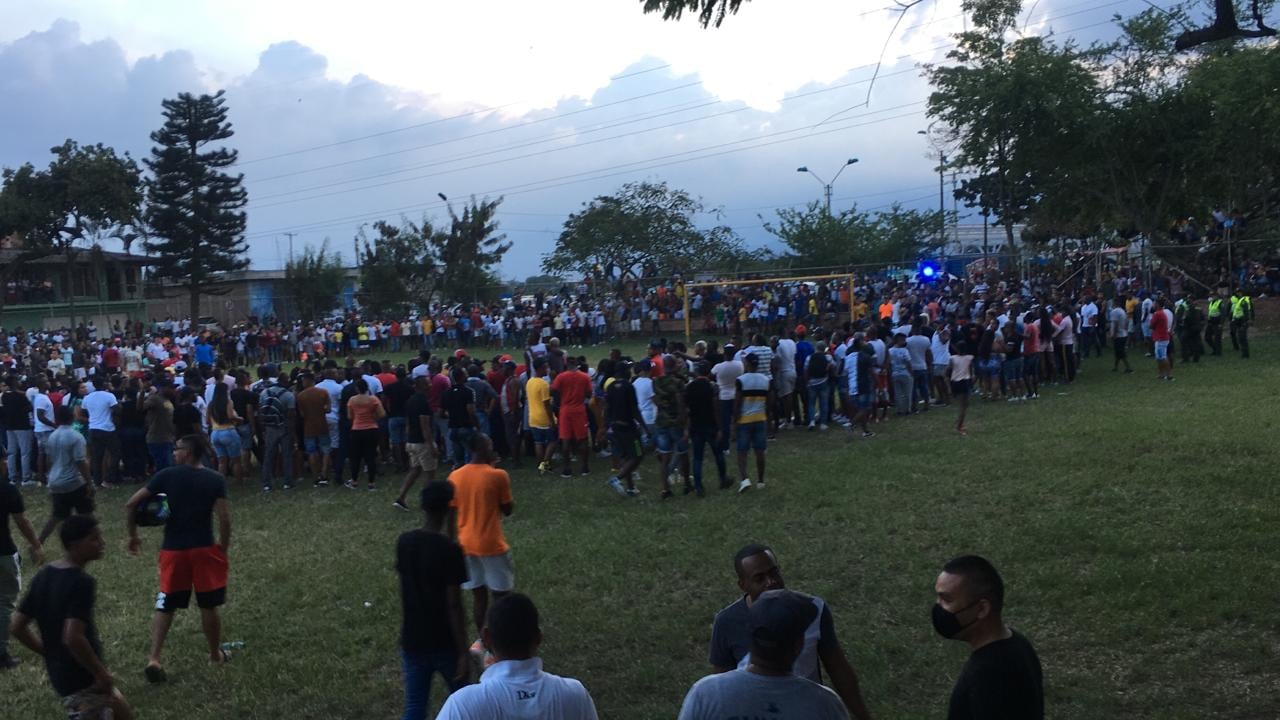 Más de 400 personas estuvieron presentes en la final del torneo relámpago del Barrio Las Orquídeas. Sin protección alguna, estas personas se congreron en esta cancha. Al final, el Esmad tuvo que intervenir. pic.twitter.com/tJJkr8lWwQ