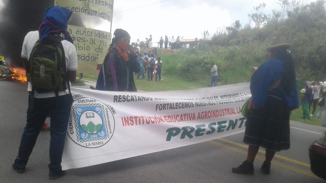 La protesta se presenta a la altura del sector conocido como La María, Piendamó, donde los integrantes de esta etnia piden la presencia en el lugar de la secretaria de Educación departamental con el fin de materializar la contratación de unos docentes para una institución educativa de esta comunidad.