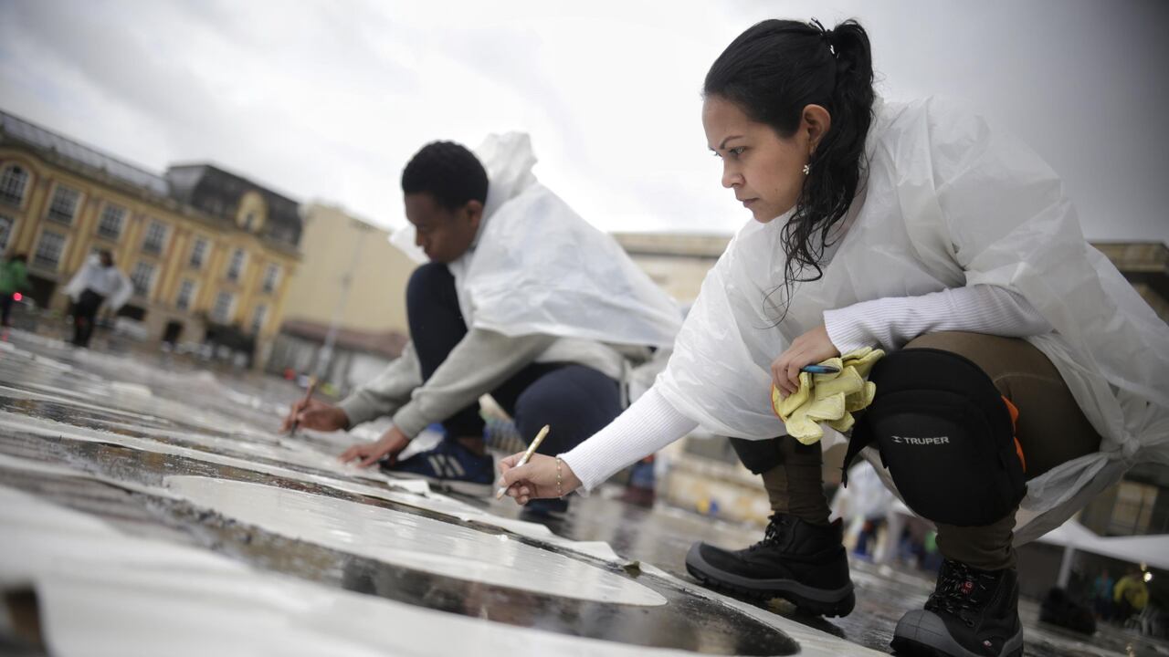 En compañía de una gran cantidad de voluntarios que se hicieron presentes en la Plaza de Bolívar de Bogotá, este lunes la artista colombiana Doris Salcedo realizó una acción de duelo, a través del arte, por los líderes asesinados en el país.