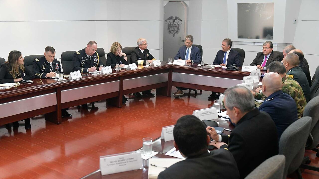 A la reunión asistieron el embajador de EE.UU. en Colombia, Kevin Whitaker; el canciller, Carlos Holmes Trujillo; el ministro de Defensa, Guillermo Botero, y altos mandos de las Fuerza Militares y de Policía.