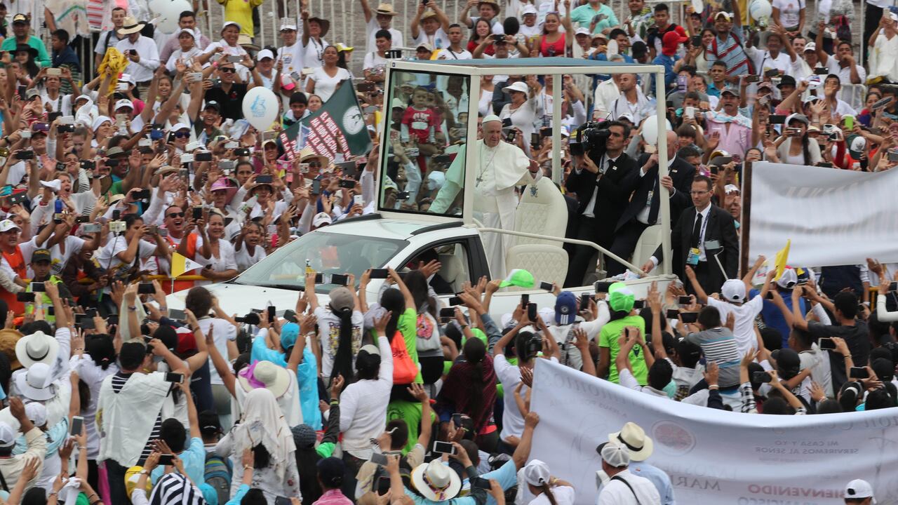 El papa realizó un recorrido de 9,5 kilómetros entre la base aérea de Apiay, ubicada en las afueras de la ciudad, y el recinto de ferias de Catama, donde oficiará su segunda misa campal en el país, en medio de miles de feligreses que salieron a las calles a saludarlo.