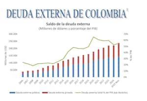 Se estima que el nivel de deuda de Colombia estará en el 65 % del PIB en 2025, una cifra que se manejó en 2020 por efectos de la pandemia del covid. Sin embargo, luego se redujo hasta el 57 % del PIB en el 2023. De ahí en adelante volvió a crecer.