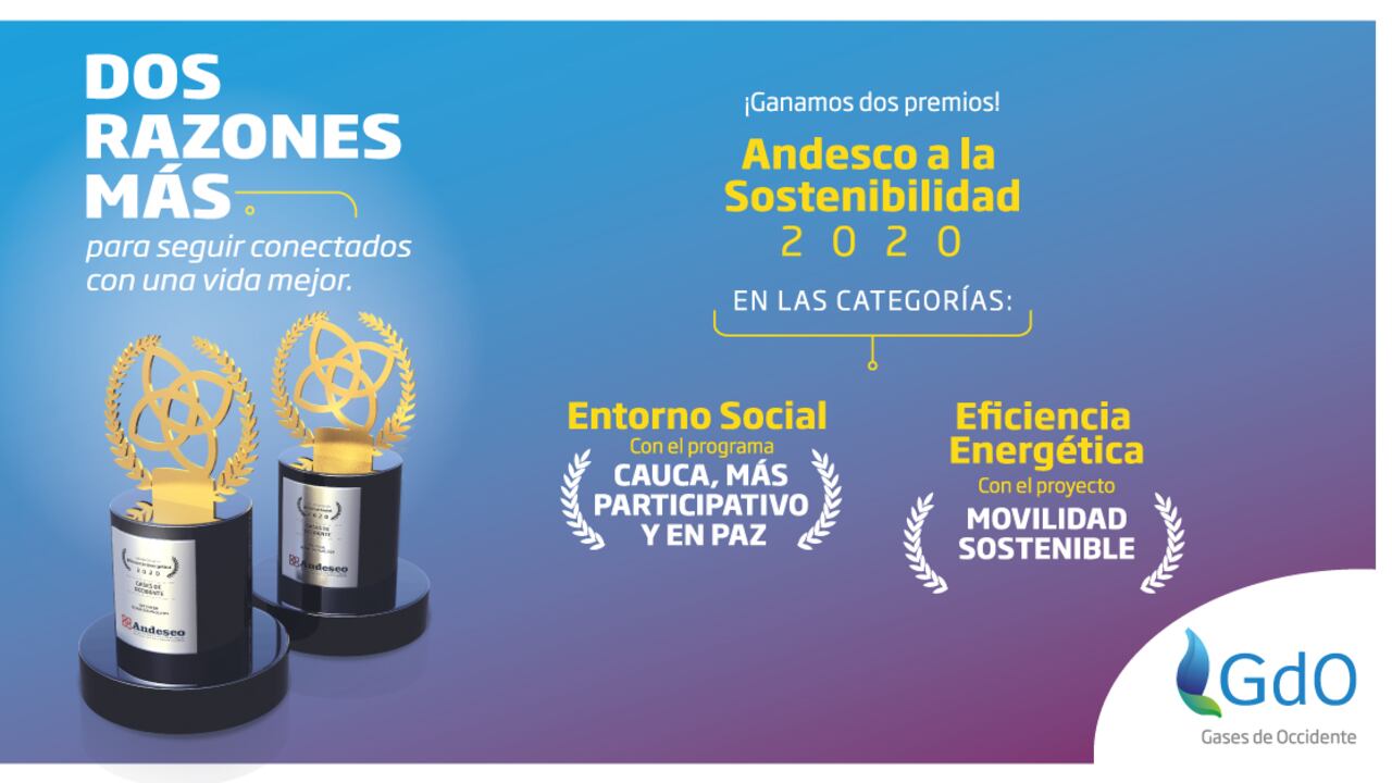 En el marco del Día Mundial de los Servicios Públicos celebrado el pasado 23 de junio, Gases de Occidente fue seleccionado como ganador entre 80 empresas participantes del Premio Andesco a la Sostenibilidad en el entorno social y del premio Eficiencia Energética, éste último con el proyecto de Movilidad Sostenible, en la categoría Empresas de Servicios Públicos y Tecnologías de la Información y las Comunicaciones.