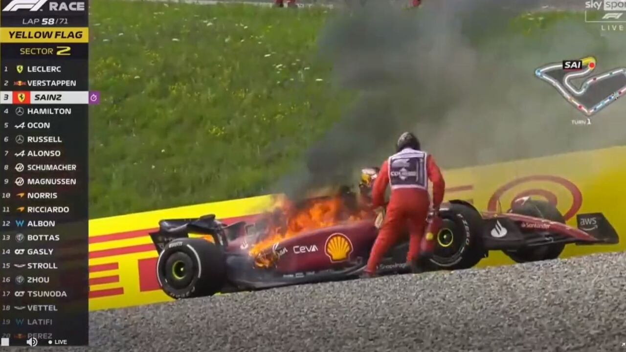 Sainz vio entonces que su motor echaba humo, obligándole a dejar la pista. Unos segundos después, el auto se incendiaba, cuando el piloto estaba todavía dentro.