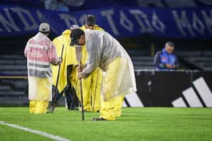 El partido inició este domingo, como estaba previsto, pero a causa del aguacero que cayó en Bogotá, tuvo que ser suspendido. Este lunes, en la tarde, cuando se reanudó el partido, el estado de la cancha seguía siendo inadecuado para jugar un partido.