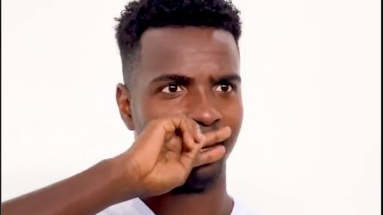 En el video se ve a Marco Pérez enfundado en una chaqueta y después se la quita para ponerse la camiseta del cuadro blanco de Manizales.