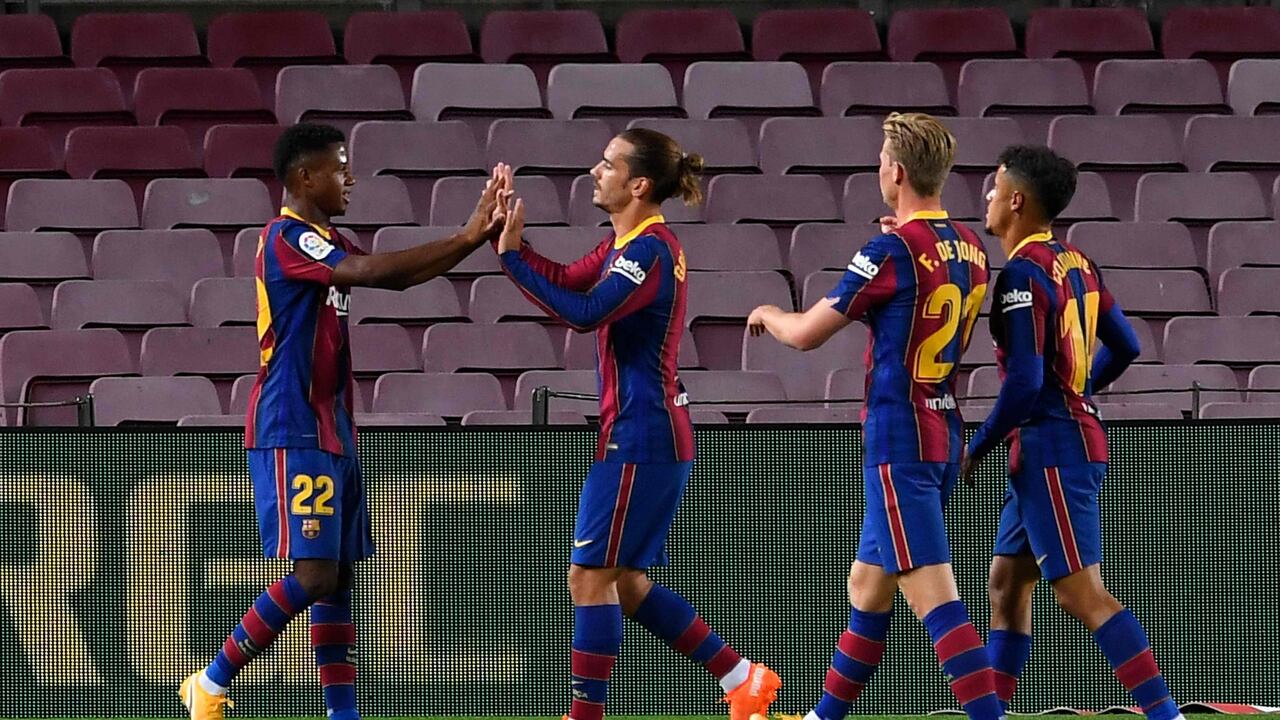 El joven Fati abrió el marcador al cuarto de hora rematando un centro de Jordi Alba (15) y repitió entrando en carrera en el área para soltar un tiro imparable (19), antes de provocar el penal, que transformó Leo Messi (35).