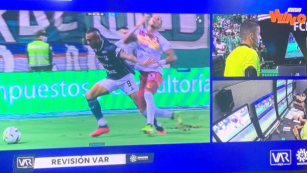 Cuando la fanaticada verdiblanca estaba celebrando la primera anotación, el juez central Bismark Santiago atiende un llamado del VAR por una posible infracción de Ángelo Rodríguez sobre Juan Camilo Angulo.