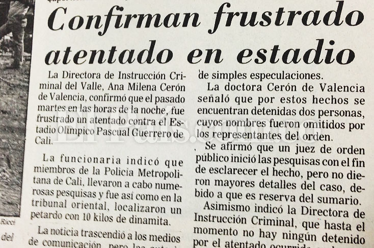 - A las 8:50 p.m. explota un carro bomba. Al parecer, el atentado iba a ser en el Pascual Guerrero, donde jugaban América-DIM.
