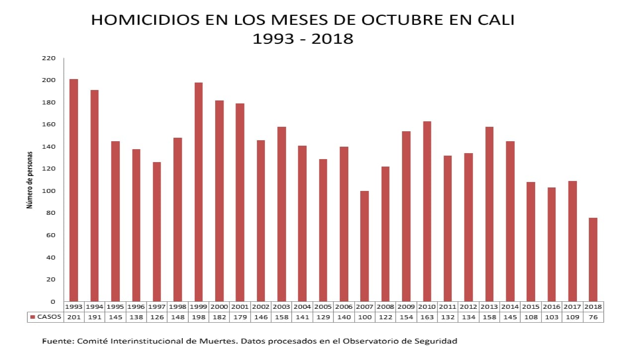 El pasado mes de octubre se registraron 76 homicidios en Cali, la cifra más baja de los últimos 26 años, de acuerdo con la Policía Metropolitana y la Secretaría de Seguridad.