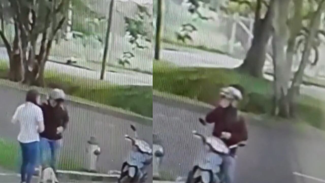 Una cámara de seguridad del sector captó el momento exacto en el que un hombre en motocicleta interceptó a una mujer que caminaba con un perrito.