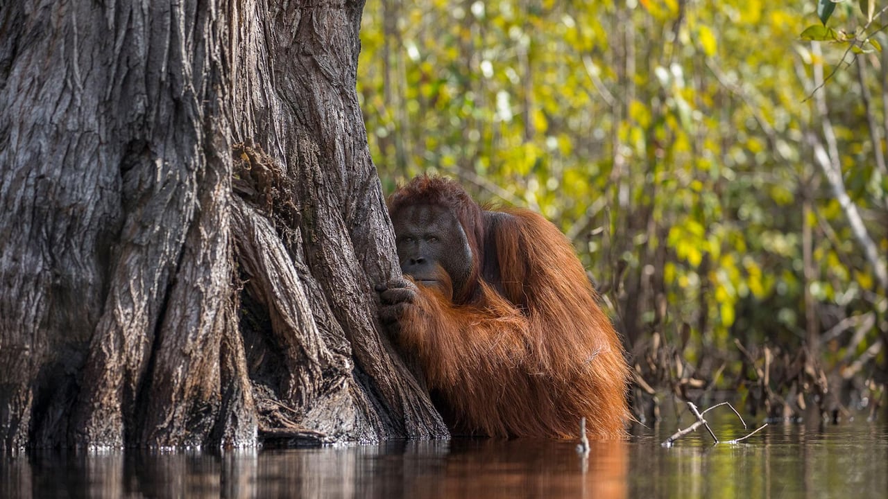 La ganadora absoluta fue capturada por el lente de Jayaprakash Joghee Bojan, un fotógrafo que creció en el Distrito indio de Nilgiris. En ella se puede ver una escena completamente inusual: un orangután macho que se esconde tras un árbol mientras intenta cruzar las aguas de un río en Borneo, Indonesia.