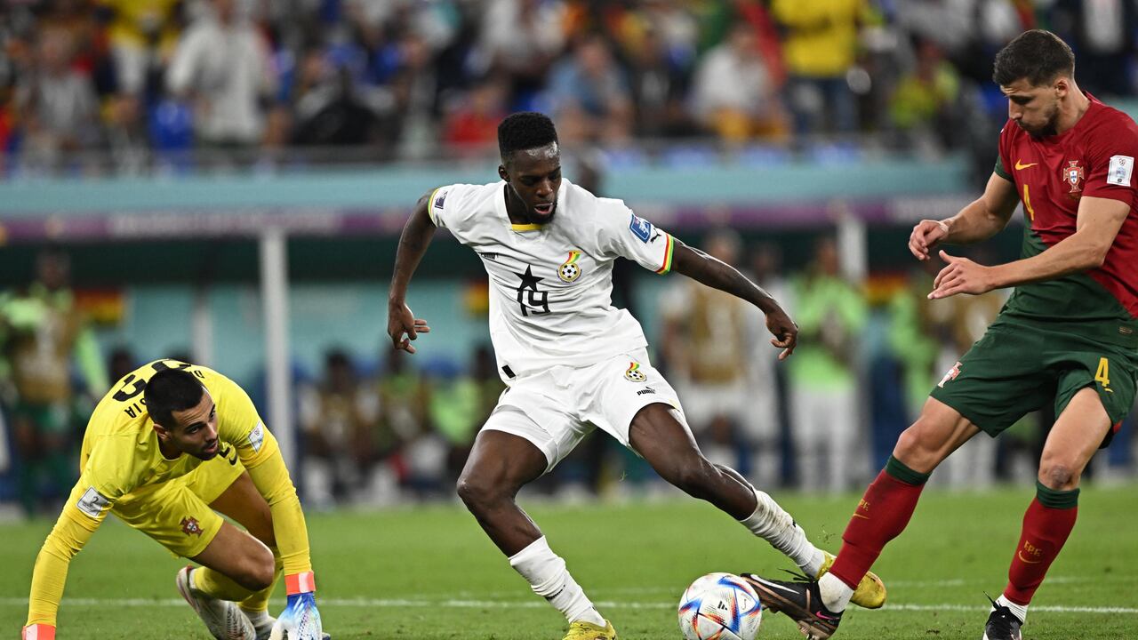 El arquero portugués Diogo Costa soltó el balón a la grama, sin percatarse que detrás estaba un delantero ghanés que por poco anota el tanto de la igualdad.