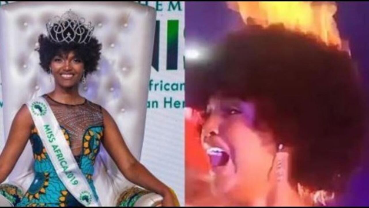 Dorcas Kasinde sufrió una bochornosa escena mientras era coronada Miss África, pues los juegos pirotécnicos del lugar hicieron que su cabello se incendiara.