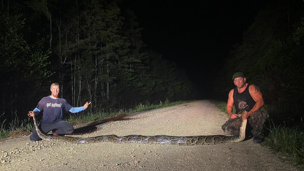 Dos cazadores marcaron un nuevo récord con la captura de una serpiente pitón de Birmania de 5,7 metros, informaron autoridades de Florida al promover la caza de una de las especies invasivas que más estragos hace en el ecosistema de los humedales de este estado de Estados Unidos.