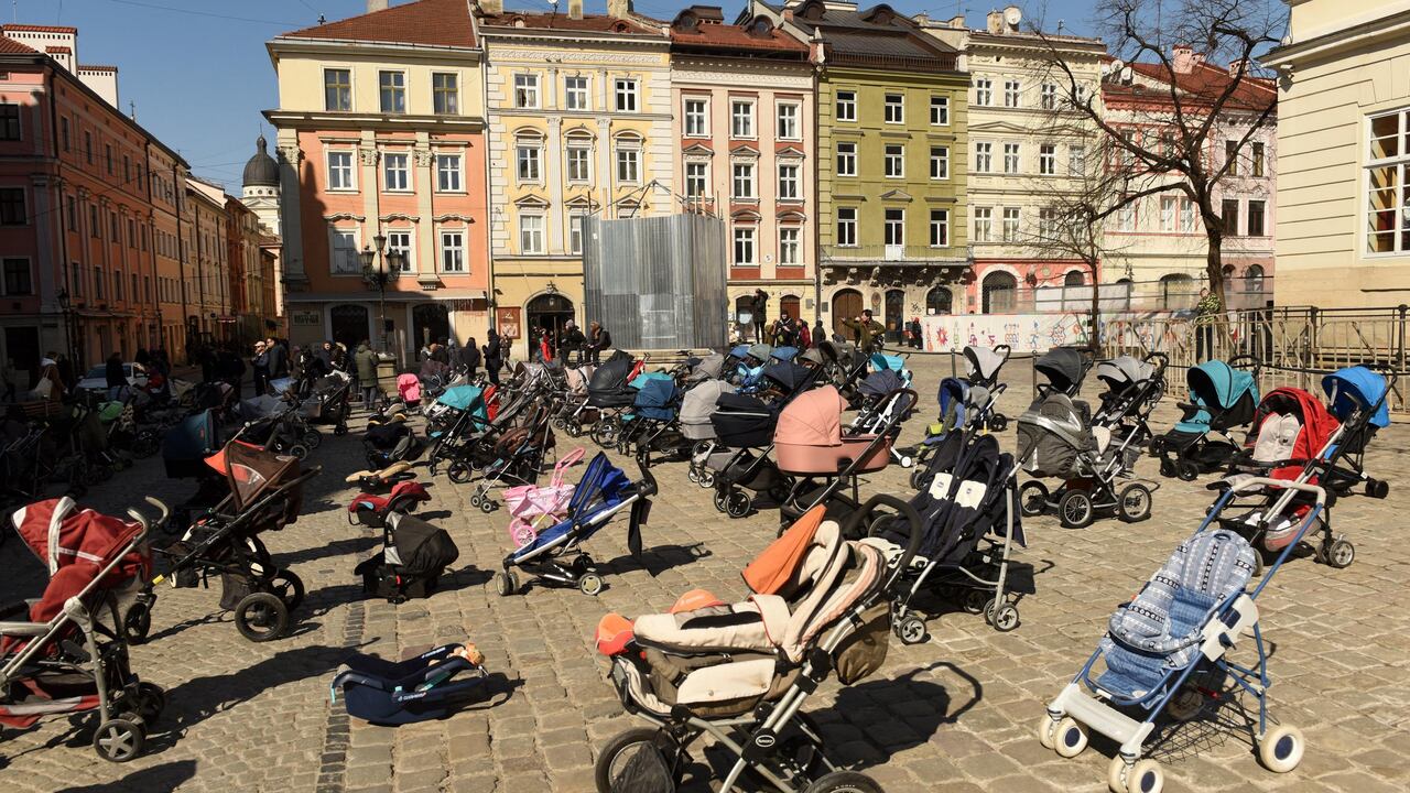 En la ciudad de Leópolis, oeste de Ucrania, activistas y padres colocaron más de un centenar de coches de bebé vacíos en una plaza, en conmemoración de los menores fallecidos.