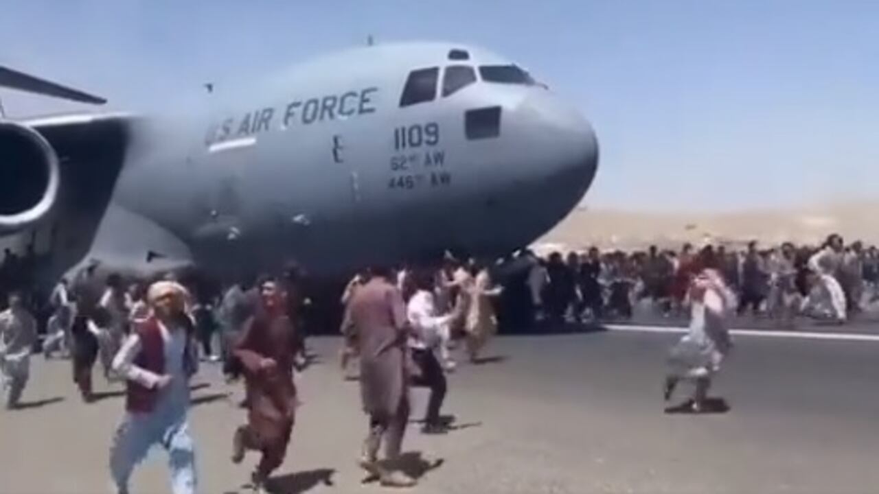 La Fuerza Aérea revisará todos los videos que circulan en las redes sociales de un avión de transporte C-17 al cual cientos de personas persiguieron, algunas tratando de aferrarse locamente a sus alas o sus ruedas. Otro video mostró al mismo avión sobrevolando Kabul y lo que parecían ser dos personas cayendo al vacío.