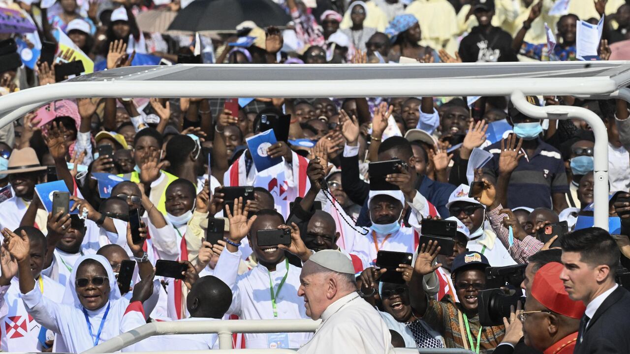 A su llegada al aeropuerto N'dolo de la capital congoleña, donde se organizaba la misa al aire libre, el papa argentino saludó desde su papamóvil a la multitud que lo aclamaba con banderas y cantos tradicionales, en un ambiente festivo pero entre grandes medidas de seguridad.