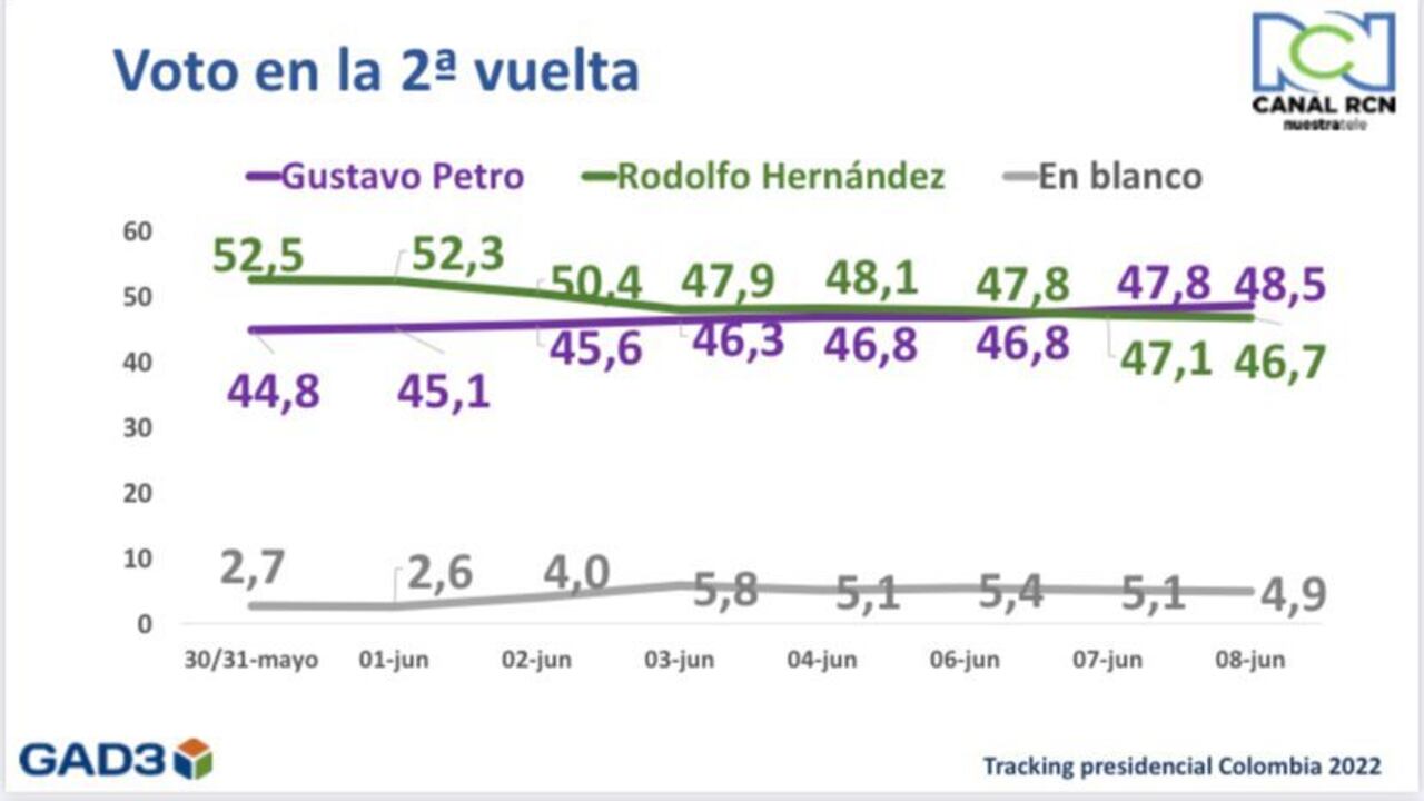 De acuerdo con el resultado de la última medición electoral realizado por la consultora GAD3, el candidato Gustavo Petro, del Pacto Histórico, tiene una intención de voto del 48,5%, mientras que Rodolfo Hernández tiene una del 46,7%.