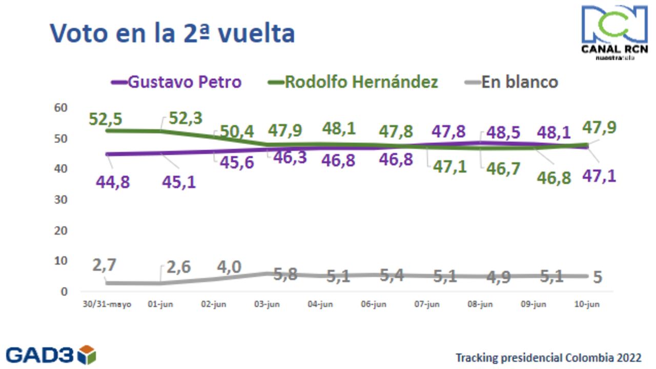 A una semana de la segunda vuelta presidencial se mantiene un cerrado cabeza a cabeza, así lo muestra la más reciente medición de la firma Gad3 para La FM, Noticias RCN, RCN Radio, NTN24, El País, entre otros. Según esta encuesta, el candidato Rodolfo Hernández tiene un 47.9 % y Gustavo Petro un 47.1% en la intención de voto