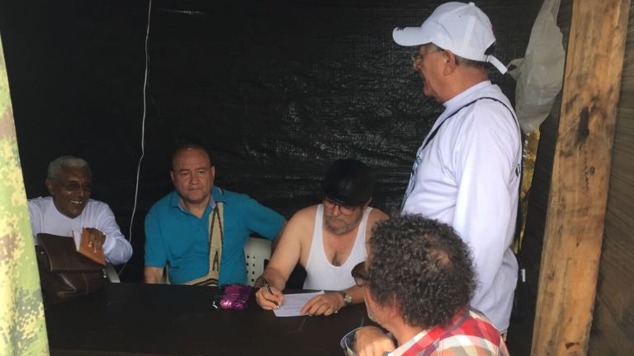 Luego de unos minutos, el camino a seguir fue por la mitad, el cual sirvió para que Rodrigo Londoño y otros seis miembros del comando central, entre ellos Pablo Catumbo, Carlos Antonio Losada, Rodrigo Granda y Joaquín Gómez, deambularan unos 50 metros entre los gritos de viva la paz.