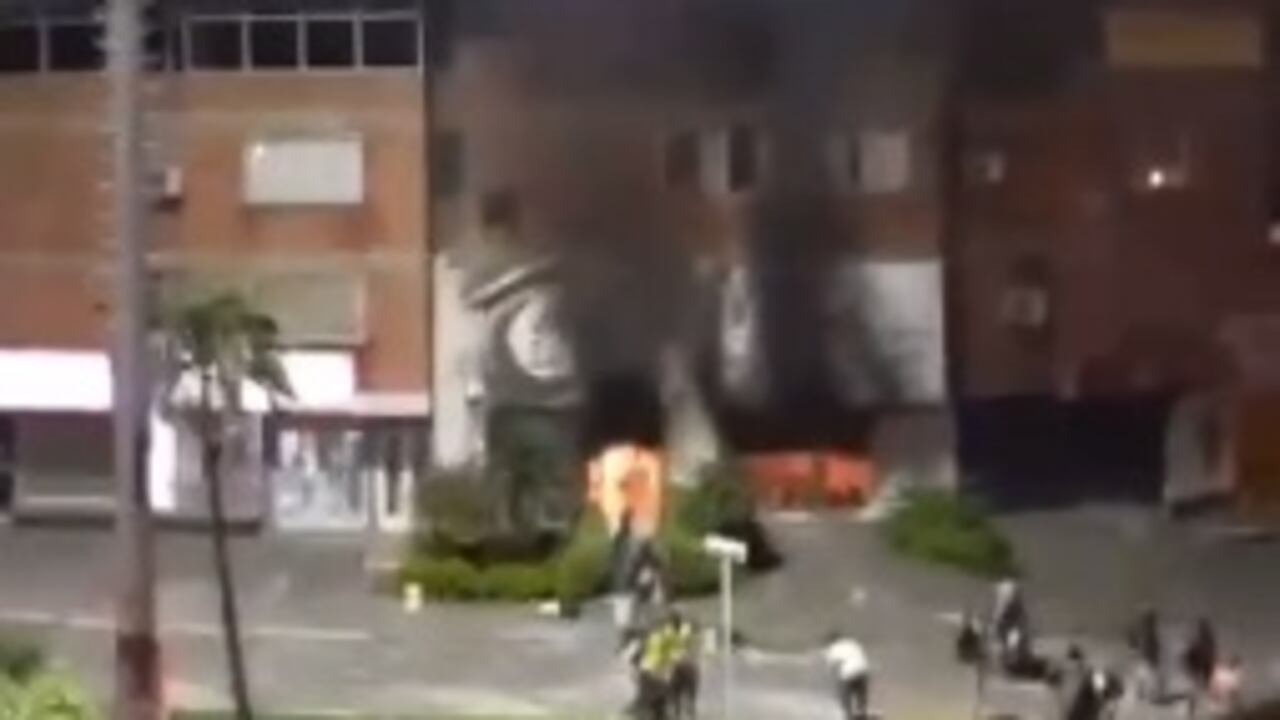 En video quedó registrado el incendio provocado en el interior de una sucursal de Bancolombia ubicada en el sector de La Luna, donde este lunes ciudadanos adelantaron una concentración que terminó en disturbios. El Cuerpo de Bomberos de Cali atendió esta emergencia.