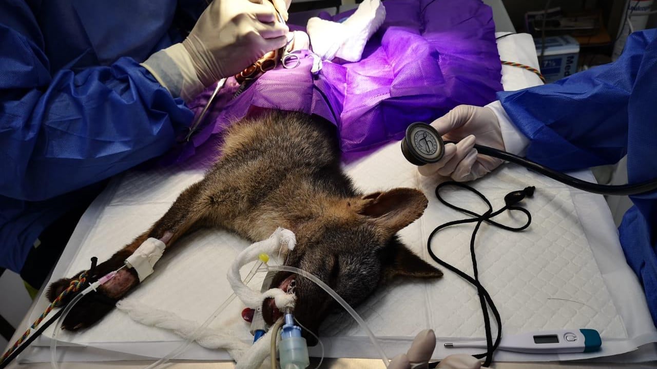 El zorro ha sido intervenido en múltiples ocasiones para corregir fracturas en la cadera y miembros posteriores sufridas en el accidente.